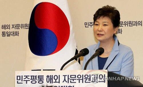 10月13日,在青瓦臺,韓國總統樸槿惠出席與“民主和平統一咨詢會議”的海外咨詢委員舉行的“統一對話”。(韓聯社)
