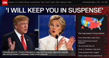 本場辯論依然延續了特朗普和希拉里彼此互相攻擊、相愛相殺的風格。甚至還出現驚心動魄的一幕:特朗普宣稱如果11月8日宣告自己與總統寶座失之交臂,他就很有可能會拒絕美總統大選的結果,因為他實在是看到了太多的黑料了。