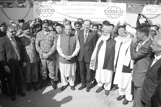 13日,巴基斯坦總理謝里夫等中巴官員在即將出海的中國(guó)貨船前合影留念。徐偉/攝