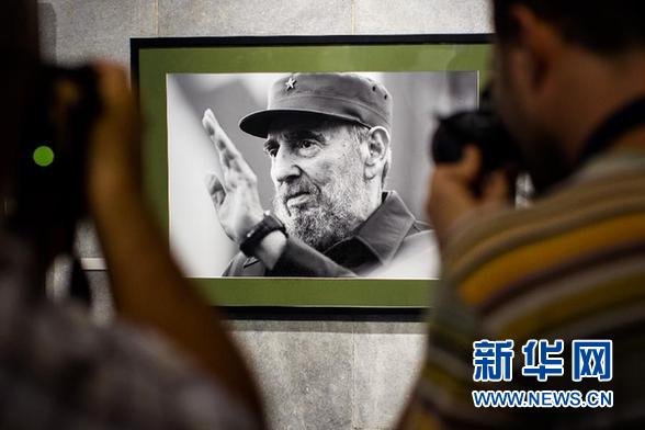 這是2014年8月12日,在菲德爾·卡斯特羅88歲生日前夕,觀眾在古巴哈瓦那一幅卡斯特羅的照片前拍照。 新華社記者劉彬攝