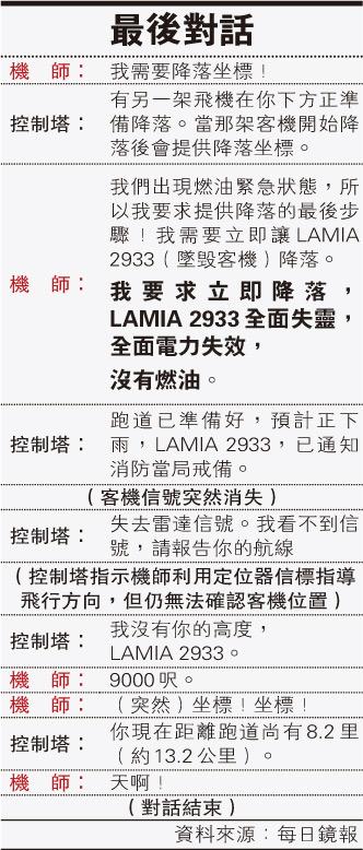 當(dāng)?shù)貢r間11月28日晚,巴西沙佩科恩斯足球俱樂部的包機在哥倫比亞安蒂奧基亞省省會麥德林市國際機場附近失事,截至目前造成71人遇難,僅6人幸存。最新曝光的機長與麥德林機場指揮塔臺的對話錄音顯示,就在墜毀前數(shù)分鐘,飛機沒有電力、燃料用盡,機長急切請求允許降落。