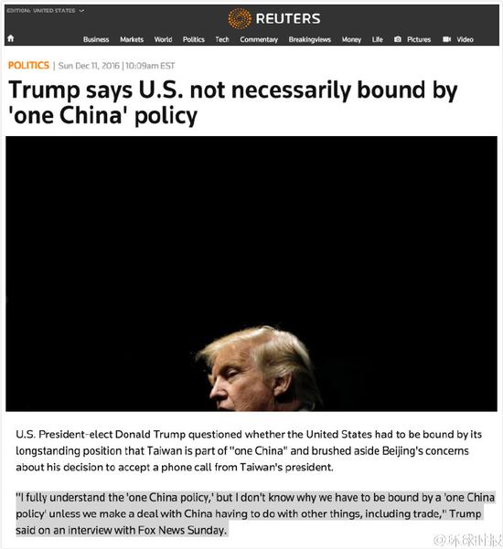 原標題:特朗普稱:美國沒必要被“一個中國政策”限制