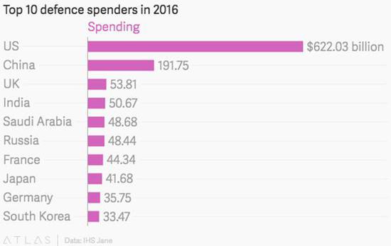 《簡氏防務》首席分析師克雷格·卡弗里在一份聲明中稱:“過去3年,由于印度人力成本上漲,采購支出受到了抑制,但是,我們期望看到的是2017年之后,印度軍隊會把注意力放在軍事現代化上。印度現在需要大量裝備來滿足其現代化轉型的需要,未來3年,印度將再次成為國防設備供應商的重要增長市場。”在2016年,全球軍費開支達到1.57萬億美元(約合人民幣10.84萬億元),下表為2016年軍費開支最高的前10個國家: