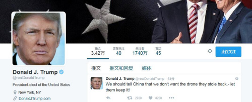 【環球網綜合報道】美國當地時間12月17日晚間,美國當選總統特朗普在推特上表示,“我們應該告訴中國,他們偷走的無人潛航器我們不想要了,就讓他們留著吧!”