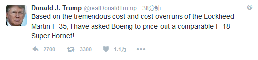 “基于洛馬公司的F-35價(jià)格過(guò)于昂貴以及預(yù)算嚴(yán)重超支的原因,我和波音談了,給我一個(gè)可與F-35‘匹敵’的F-18超級(jí)大黃蜂的報(bào)價(jià)。”