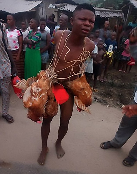 【環球網綜合報道】據英國《每日郵報》12月28日報道,近日,在尼日利亞拉各斯州的伊科羅杜(Ikorodu),一名偷雞的男子遭到當地人毒打,并被扒光衣服,在脖子上掛上三只雞后,強行拉到大街上游行。