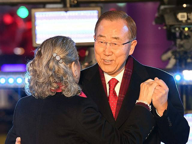 2016年12月31日,美國紐約時報廣場,卸任的聯合國秘書長潘基文與妻子在迎新年慶祝活動上翩翩起舞。(新華/法新)