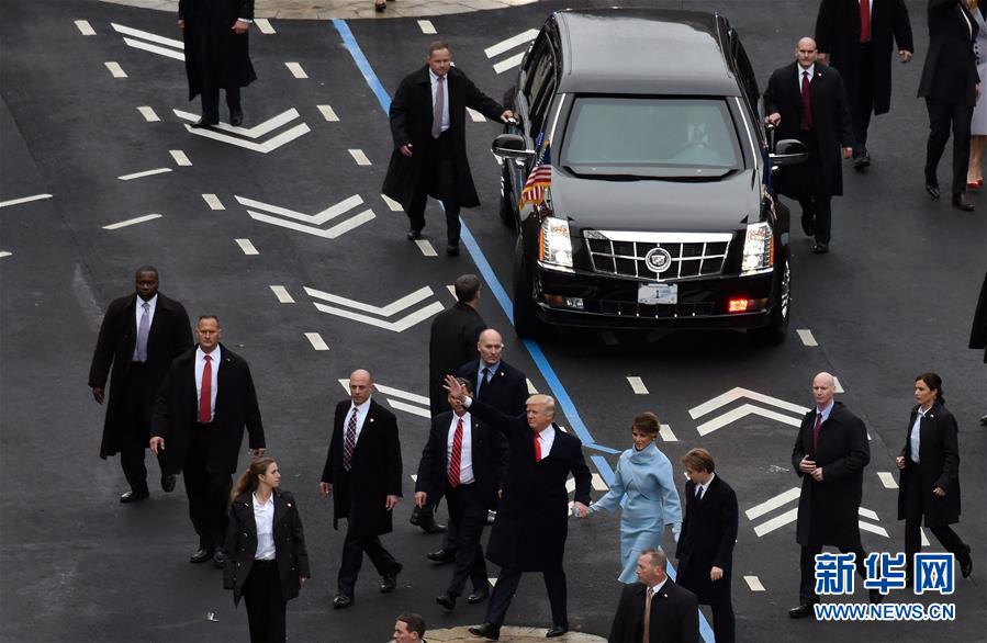 1月20日,在美國(guó)首都華盛頓舉行的總統(tǒng)就職游行上,美國(guó)總統(tǒng)特朗普(前中)向人們揮手致意。美國(guó)總統(tǒng)特朗普的就職游行20日在華盛頓舉行。特朗普當(dāng)日在華盛頓國(guó)會(huì)山舉行的就職典禮上正式宣誓就任美國(guó)第45任總統(tǒng)。 新華社記者殷博古攝