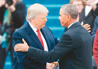 1月20日,在美國(guó)首都華盛頓國(guó)會(huì)山,特朗普(左)與奧巴馬在美國(guó)第45任總統(tǒng)就職典禮上握手。
