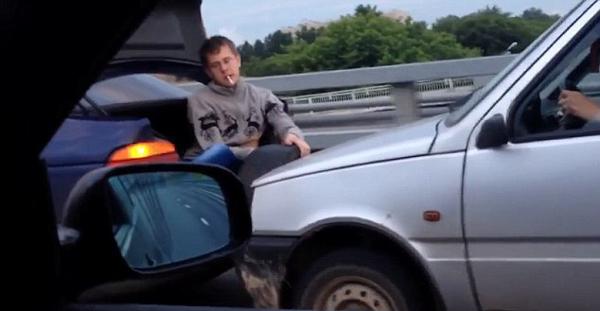 據(jù)英國《每日郵報(bào)》1月23日報(bào)道,近日,一則走紅網(wǎng)絡(luò)的視頻顯示,在俄羅斯一條車來車往的馬路上,一輛深藍(lán)色轎車在后方白色轎車和一名大膽乘客的助力下向前行駛。白色轎車通過抵住藍(lán)色轎車尾部來推動其向前行駛。前方轎車敞開的后備箱內(nèi)坐著一名男子,他的嘴里叼著香煙,神情沒有一絲懼怕;并且手握一只輪胎,以防撞擊時(shí)損壞車身。