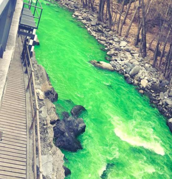 [環(huán)球網(wǎng)綜合報(bào)道] 據(jù)英國(guó)《鏡報(bào)》3月4日?qǐng)?bào)道,當(dāng)?shù)貢r(shí)間3月2日,西班牙境內(nèi)一條清澈的河流在一夜之間突然變成了亮麗的翠綠色。雖然綠色鮮亮濃郁十分養(yǎng)眼,但當(dāng)?shù)卦S多市民還是心里發(fā)毛:“這該不會(huì)是重污染吧?”