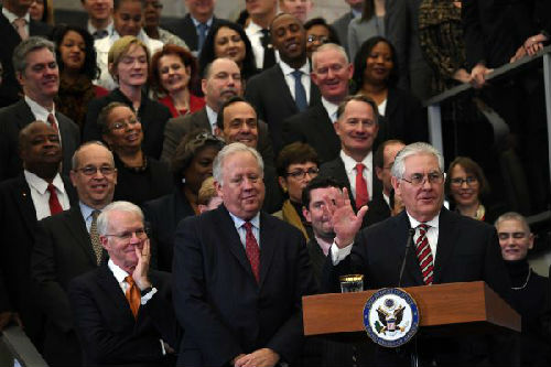 資料圖片:美國務卿雷克斯·蒂勒森(前右) 新華社記者殷博古攝