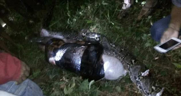 據(jù)說,發(fā)現(xiàn)該巨蟒的前一晚,即阿克巴爾·薩魯比羅(Akbar Salubiro)失蹤當晚,有人聽到棕櫚林里有哭聲。抓到這條蟒蛇后,隔著它的肚皮就能看出來,阿克巴爾一定是被這條巨蟒給吞了。這種蟒蛇吞下獵物前,通常會先將獵物緊緊纏住使其窒息而死。