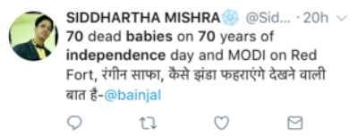 網友@SIDDHARTHA MISHRA:獨立70周年紀念日,死了70個孩子,而莫迪卻在紅堡(作獨立日演說)。
