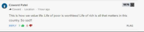 網友@Coward Pate:這就是我們對待生命的態度,貧窮人們的生命(在印度)毫無價值!在這個國家,只有富人的生命才值得一提。太悲傷了! !