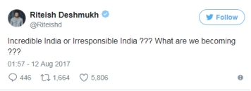 無怪乎寶萊塢男演員里提什·德什穆克在社交網站上這樣寫道:“不可思議的印度還是不負責任的印度???我們變成了什么???”