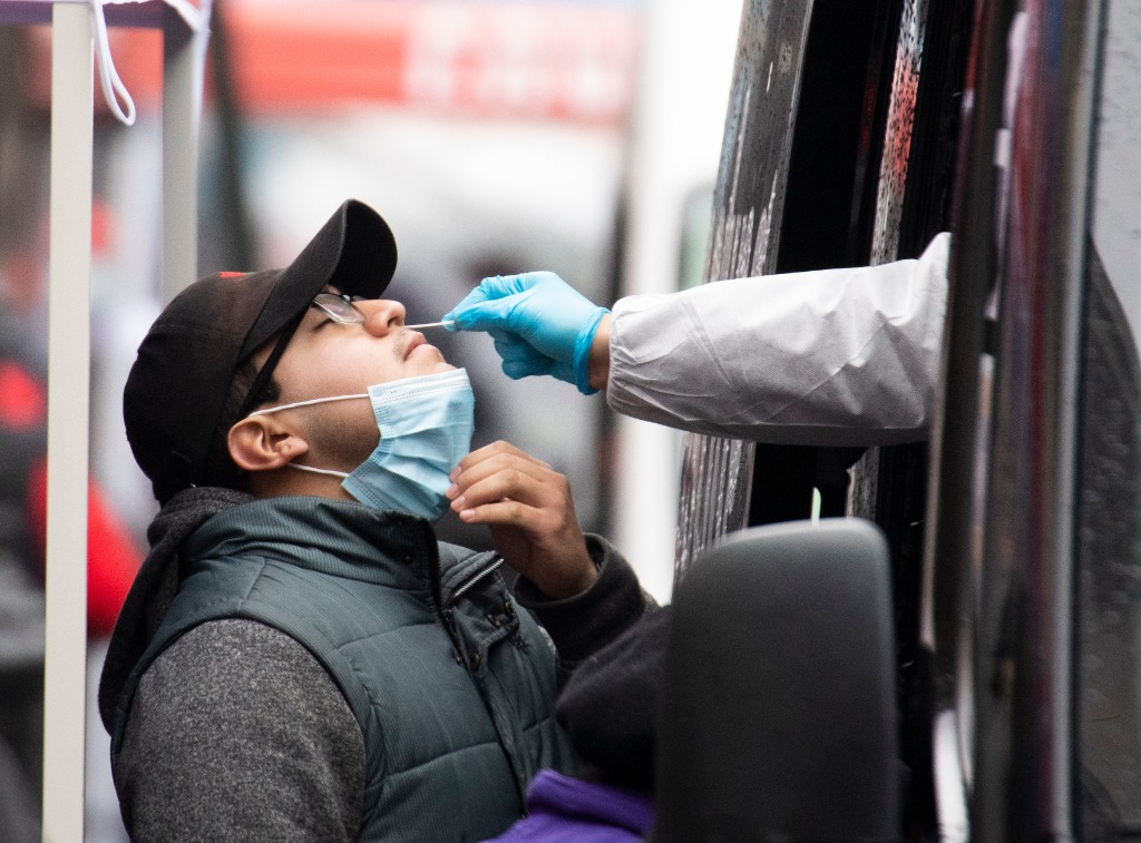 2021年12月29日,醫護人員在美國紐約街頭的新冠檢測點為檢測者采樣。新華社記者王迎攝