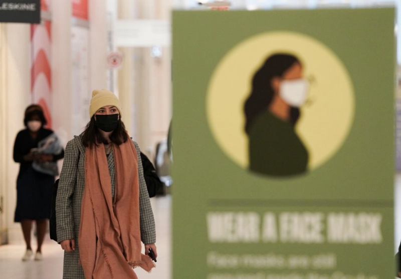 3月29日,人們從美國紐約世貿中心車站內的防疫提示牌旁走過。新華社記者王迎攝