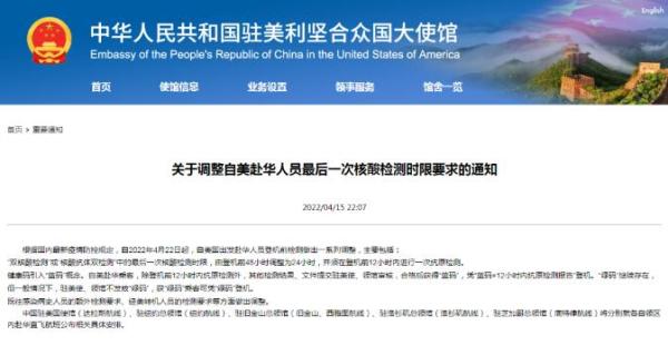 4月15日,中國駐美國大使館表示,自當地時間4月22日起,對自美國出發赴華人員登機前檢測做出一系列調整, “雙核酸檢測”或“核酸抗體雙檢測”中的最后一次核酸檢測時限,由登機前48小時內調整為24小時內,并須在登機前12小時內再進行一次抗原檢測。