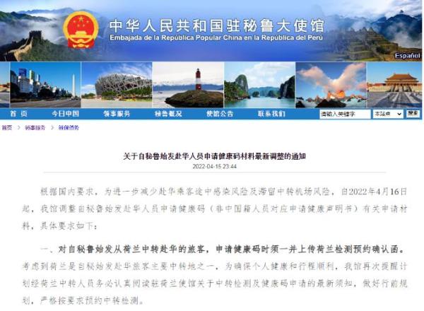 中國駐秘魯大使館表示,自當地時間4月16日起,自秘魯始發從荷蘭中轉赴華的人員,申請健康碼時須一并上傳荷蘭檢測預約確認函。