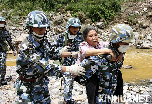 5月18日,海軍陸戰隊戰士在轉移受災群眾。 新華社記者 查春明 攝