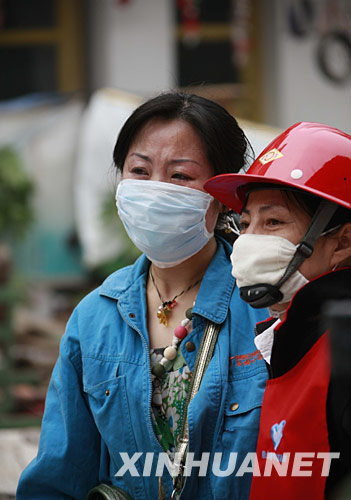 5月18日,一名受困者親屬(左)在綿竹市漢旺鎮搜救現場守候。