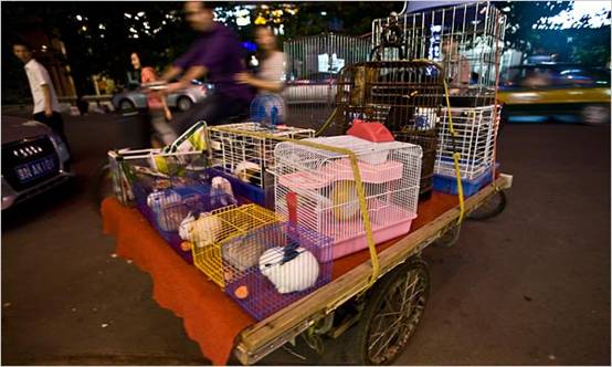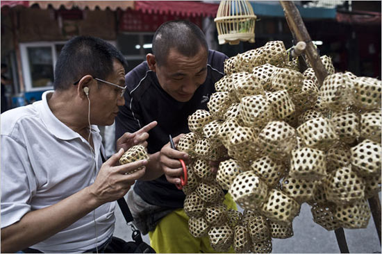 李海侖(音)屬于不需要吆喝的小販,他賣的是數百只放在竹篾籠子里的蛐蛐兒,隨處都會發出震耳欲聾的尖銳響聲。從七月到十月,李騎著車帶著他的蛐蛐兒在城里穿梭,根據蛐蛐叫聲的質量和買家的眼光,每只蛐蛐可賣得五角到一元。