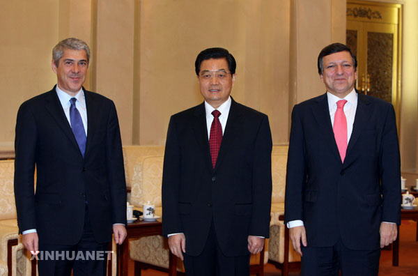 11月28日,國家主席胡錦濤在北京人民大會堂會見來京出席第十次中歐領導人會晤的歐盟輪值主席國葡萄牙總理蘇格拉底(左)和歐盟委員會主席巴羅佐。 新華社記者 樊如鈞攝