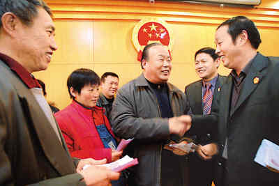 圖為山東省濟南市長清區法院法官日前給農民工發放拖欠工資及工程款。袁鵬 攝