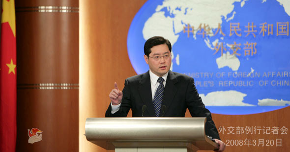 2008年3月20日下午,外交部發言人秦剛舉行例行記者會,就近期拉薩發生的打砸搶燒嚴重暴力犯罪事件等問題答問。
