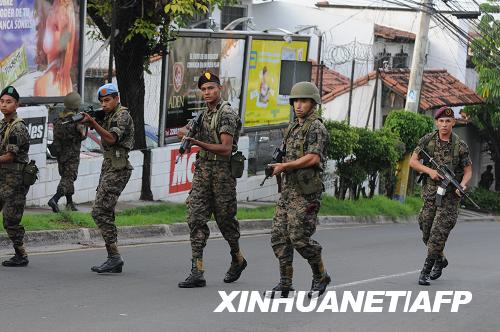 6月28日,在洪都拉斯首都特古西加爾巴,士兵包圍總統塞拉亞的住所。洪都拉斯總統私人秘書雷納當天說,塞拉亞總統當天被軍方扣押表明洪都拉斯已經發生軍事政變。新華社/法新