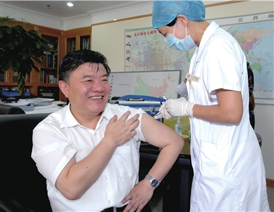 陳竺率先試種第二針甲流疫苗 全國13300多名志愿者將試種第二針 其中北京1513人已試種