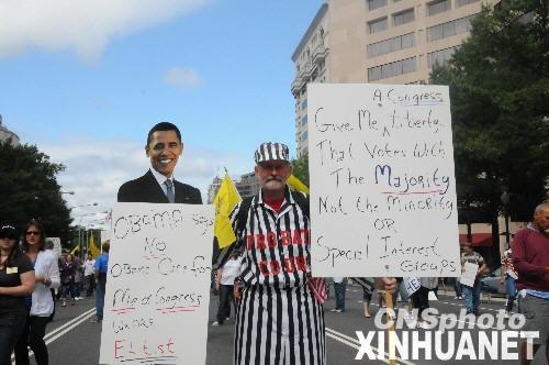 記者在現場看到,示威者舉著美國總統奧巴馬和美國眾議院議長佩洛西的肖像以及寫滿“不要更多的開支,不要更多的稅收,不要更多的謊言”、“我不是你的提款機”、“支持奧巴馬的醫療改革方案等于自殺”等各種各樣的標語,還有人高喊“奧巴馬撒謊”、“我們受夠了”等口號。