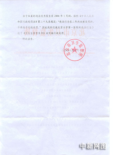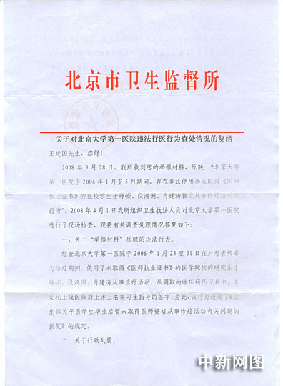 北京市衛(wèi)生監(jiān)督所的復(fù)函,熊卓為的丈夫王建國(guó)提供
