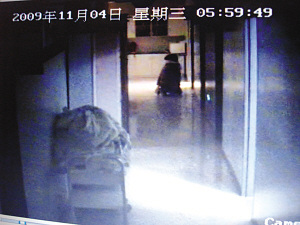 監(jiān)控錄像拍攝的徐寶寶母親跪在醫(yī)生辦公室前的場景。
