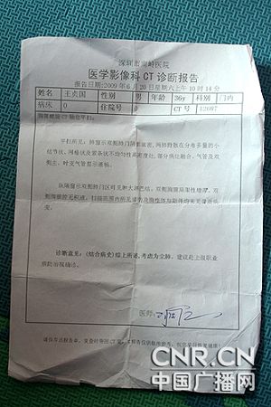 說話的人叫鐘家泉,是這群農民工的代表,記者見到他是在深圳市郊的一處簡易房內,包括廁所在內,房間面積不超過10平米,而這里卻住著他的10多位工友,地上沒有床,救濟站提供的棉被是房間里唯一的家具。這些人有的因為病痛已經無法工作,有的因為疑似塵肺而被包工頭辭退,難聞的氣味和對死亡的恐懼彌漫著整個房間。他們因為職業病檢查受阻而走到一起,目前已有120多人。他們都有不同程度的咳嗽、胸悶、呼吸困難等癥狀。工人們說,十多年來他們一直在深圳當炮工,每天都要吸入大量粉塵,但以前并不知道這會危及生命。他們說,自己已經有兩三個老鄉死了,死掉的時候他們都親眼看到了,現在感覺自己的身體和死掉人的癥狀幾乎相同。而一位在湖南張家界中醫院做過檢查的工友說:醫生照出來一看,說這個病很嚴重,最后,我跟他說明了,我說我打了幾十年風鉆,他說肯定是塵肺病。