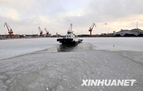 渤海和黃海北部沿岸出現近30年來最嚴重海冰冰情。1月12日,一艘拖船行駛在結冰的山東萊州港內。 受近日寒潮大風天氣影響,山東渤海和黃海北部沿岸出現近30年來最嚴重海冰冰情,萊州灣海域500多條漁船受困,對當地群眾生產、生活造成較大影響。當地邊防、漁政等涉海部門已啟動應急預案,全力救助受困群眾。1月12日,國家海洋局北海分局向遼東灣發布海冰警報,提醒渤海和黃海北部沿海各部門和單位做好相關準備。新華社記者 朱崢攝