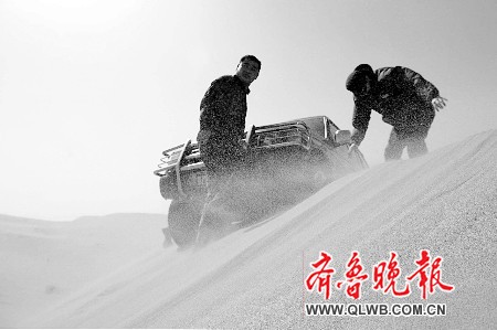24日,在開往沙漠深處的路上,車輪陷入沙里,挖沙是沙漠司機的家常便飯。本報特派記者張中攝