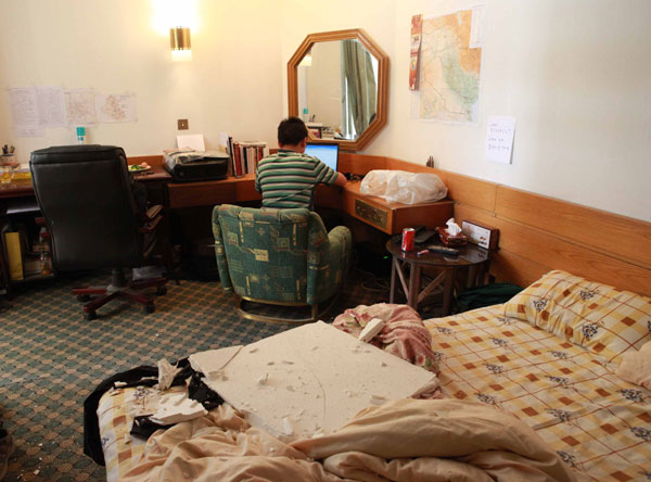 4月4日,在伊拉克首都巴格達(dá),新華社駐巴格達(dá)分社記者在爆炸受損的房間中搶發(fā)稿件。 新華社記者宋聃攝