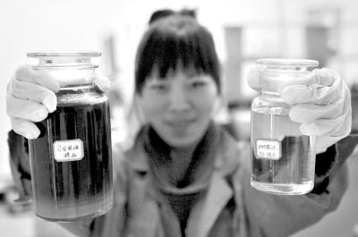 青海潔神環(huán)境能源產(chǎn)業(yè)有限公司工作人員在對比“地溝油”(左)和由餐廚垃圾處理而成的生物柴油。新華社記者 張宏祥 攝