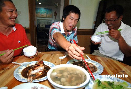 中秋佳節(jié)前夕,前來閩東霞浦縣三沙鎮(zhèn)招聘短期漁工的臺商陳樹旺(圖中),在閩東霞浦縣三沙臺胞公寓與這里的工作人員共進午餐,感受“家庭”溫馨。近三十年來,閩東霞浦縣三沙港對臺小額貿(mào)易和民間漁鈔交易等經(jīng)營規(guī)模均居?xùn)|南沿海對臺經(jīng)貿(mào)的前列。 中新社發(fā) 劉可耕 攝
