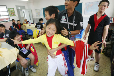 臺北特奧輪鞋選手黃泰龍(中排中)與大陸選手(前)交換徽章后熱情環抱。