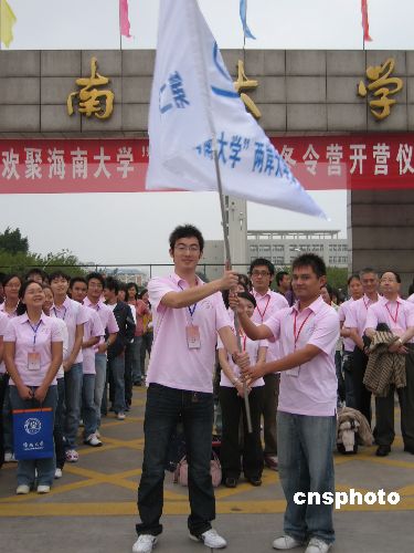 11月11日,第二屆“歡聚海南大學(xué)”兩岸大學(xué)生冬令營(yíng)在海口開(kāi)營(yíng),來(lái)自臺(tái)灣五所高校的五十多位師生將和海南大學(xué)等三所大陸高校師生一起暢游瓊島,并開(kāi)展豐富多彩的聯(lián)誼活動(dòng)。圖為臺(tái)灣政治大學(xué)學(xué)生張廷飛(右)和海南大學(xué)學(xué)生王寅(左),共同揮舞冬令營(yíng)營(yíng)旗。 中新社發(fā) 彭小云 攝