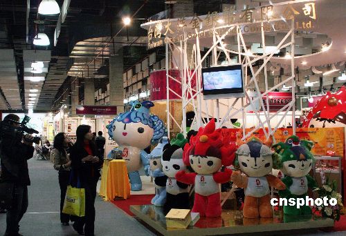正在臺北舉辦的一個禮品展上出現北京奧運吉祥物福娃和模仿主運動場鳥巢造型的展攤。