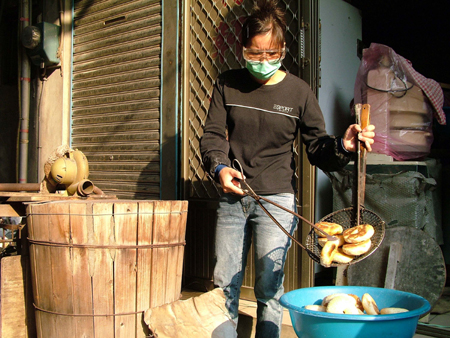 繼光餅一早開賣,通常上午八時至九時就賣完了,做餅的師傅前一天要先讓面團發(fā)酵,最遲清晨五時要開始揉面。燒爐、貼爐要相當(dāng)技巧,只見高明中一邊解說,兩手不停地將面團貼上高溫約攝氏四百度的爐子,分秒必爭,只因為溫度不對了,面團就會掉到炭火里。