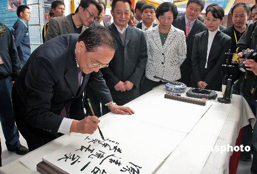 十二月十一日,在泉州參加“二00七泉臺(tái)產(chǎn)業(yè)合作投資洽談會(huì)”的國(guó)民黨副主席關(guān)中先生,來到中國(guó)閩臺(tái)緣博物館,親筆寫下“閩臺(tái)一家親 淵源流長(zhǎng)”的題詞,為兩岸未來送上美好祝福。當(dāng)日,“二00七泉臺(tái)產(chǎn)業(yè)合作投資洽談會(huì)”在泉州開幕。中新社發(fā) 傅丹丹 攝