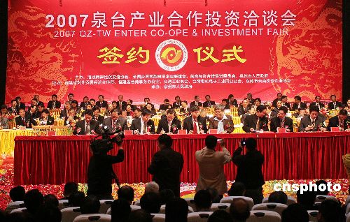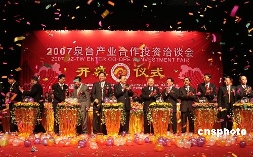十二月十一日,“二00七泉臺產業合作投資洽談會”在僑鄉福建泉州開幕,商務部、國臺辦有關官員及臺灣島內各界知名人士、在大陸臺商等千余嘉賓參加。本屆“產洽會”突出“產業合作、共謀雙贏”主題,集推介、論壇、洽談、簽約、考察為一體,旨在打造新的臺商投資聚集區。中新社發 傅丹丹 攝