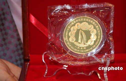 由中國臺(tái)北奧委會(huì)、臺(tái)灣大洋金銀幣有限公司主辦的“二00八年北京第二十九屆奧運(yùn)會(huì)紀(jì)念金銀幣慈善拍賣會(huì)”將于一月二十七日在臺(tái)北誠品書店信義店展演廳舉行。圖為大洋金銀幣有限公司提供,將在拍賣會(huì)上拍賣、由中國金幣總公司發(fā)行的北京奧運(yùn)會(huì)分會(huì)賽場(chǎng)“一帆風(fēng)順”五盎司紀(jì)念金章。中新社發(fā) 陳立宇 攝