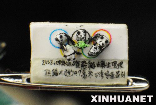 臺(tái)灣著名雕刻藝人陳逢顯用了6個(gè)月的時(shí)間,用樹脂為材料,在針鼻大的地方,成功雕刻出兩件熊貓與奧運(yùn)相結(jié)合的微雕作品,以此表達(dá)他盼望北京成功舉辦奧運(yùn)會(huì)的心情。圖為陳逢顯先生雕刻的5只熊貓與奧運(yùn)五環(huán)旗,熊貓尺寸為0.7毫米,作品下方為針鼻(3月18日攝)。 新華社記者 陳樹根 攝