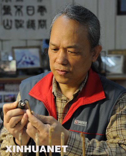臺(tái)灣著名雕刻藝人陳逢顯用了6個(gè)月的時(shí)間,用樹脂為材料,在針鼻大的地方,成功雕刻出兩件熊貓與奧運(yùn)相結(jié)合的微雕作品,以此表達(dá)他盼望北京成功舉辦奧運(yùn)會(huì)的心情。圖為正在雕刻的52歲的陳逢顯先生(3月18日攝)。 新華社記者 陳樹根 攝